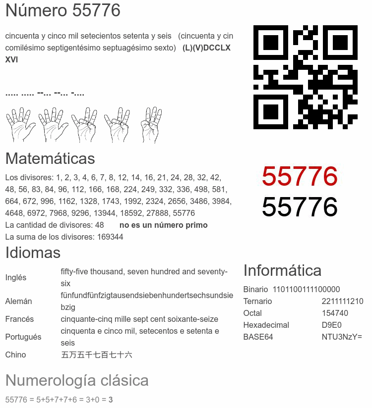 Si conoce algo interesante sobre el número 55776 o cualquier número natural (entero positivo), por favor escríbanos.Número 55 776 en otras unidades