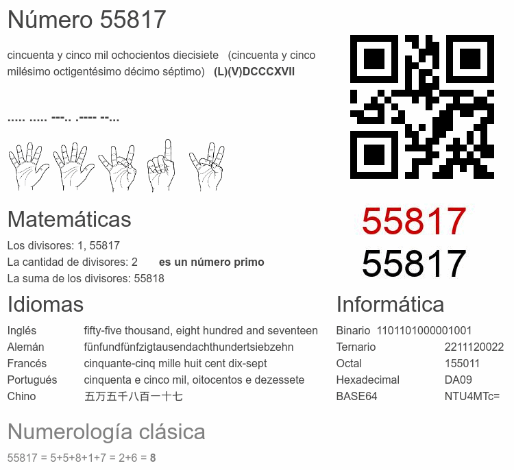 Si conoce algo interesante sobre el número 55817 o cualquier número natural (entero positivo), por favor escríbanos.Número 55 817 en otras unidades