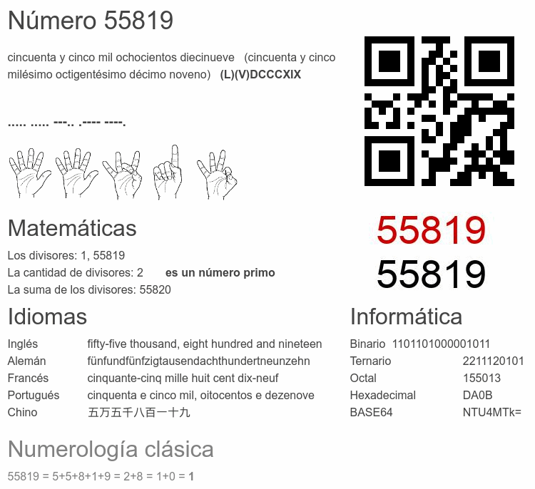Si conoce algo interesante sobre el número 55819 o cualquier número natural (entero positivo), por favor escríbanos.Número 55 819 en otras unidades
