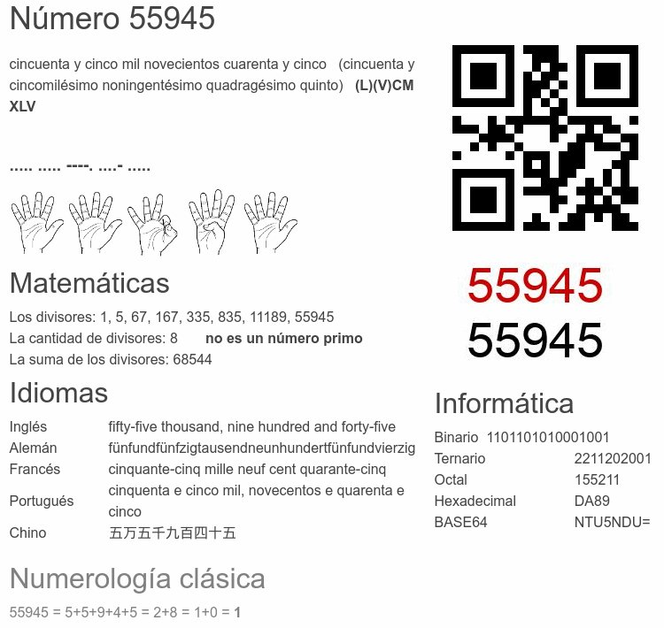 Si conoce algo interesante sobre el número 55945 o cualquier número natural (entero positivo), por favor escríbanos.Número 55 945 en otras unidades