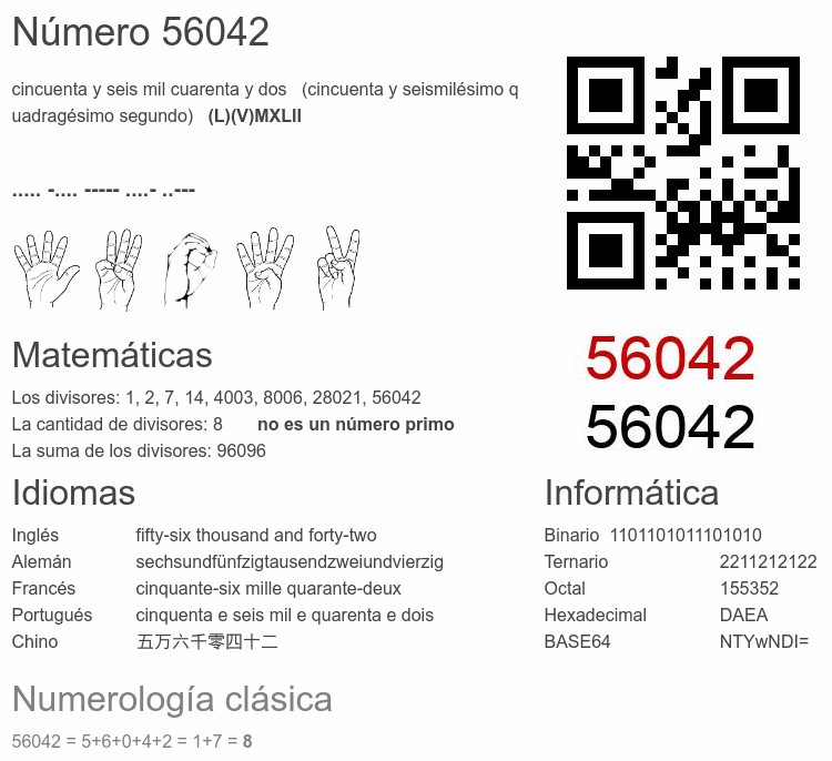 Si conoce algo interesante sobre el número 56042 o cualquier número natural (entero positivo), por favor escríbanos.Número 56 042 en otras unidades
