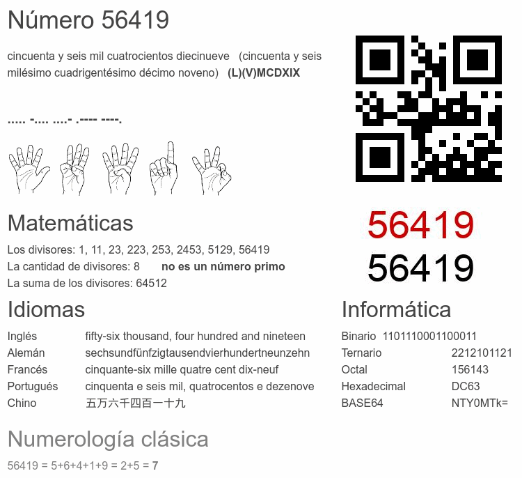 Si conoce algo interesante sobre el número 56419 o cualquier número natural (entero positivo), por favor escríbanos.Número 56 419 en otras unidades