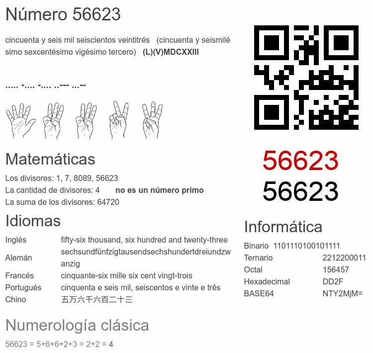 Si conoce algo interesante sobre el número 56623 o cualquier número natural (entero positivo), por favor escríbanos.Número 56 623 en otras unidades
