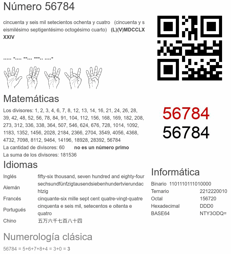 El número par 56 784 se dice 🔊, y se escribe con las palabras: cincuenta y seis mil setecientos ochenta y cuatro. El número ordinal 56784.° se dice 🔊 y se escribe como: cincuenta y seismilésimo septigentésimo octogésimo cuarto. El significado del número 56784 en Matemáticas: Es un primo? Factorización y árbol de factores primos. La raíz cuadrada de y la raíz cúbica de 56784. El significado en informática, numerología, códigos e imágenes, escritura y denominación en otras lenguas. Otras curiosidades relacionadas con el 56784.