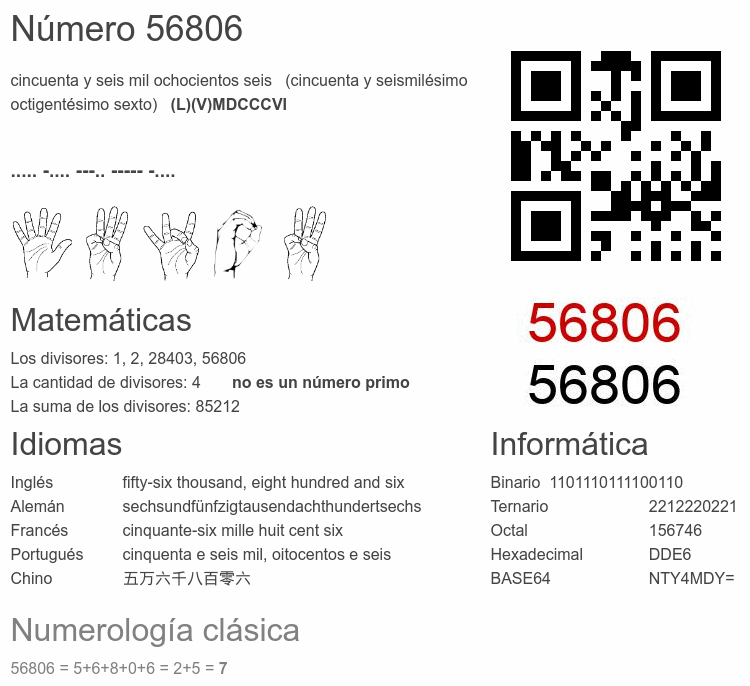 Si conoce algo interesante sobre el número 56806 o cualquier número natural (entero positivo), por favor escríbanos.Número 56 806 en otras unidades