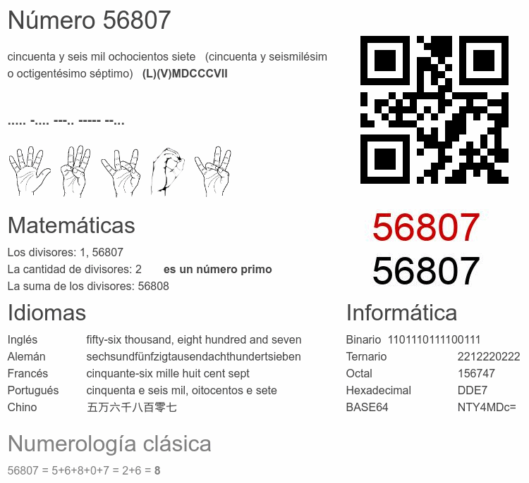 Si conoce algo interesante sobre el número 56807 o cualquier número natural (entero positivo), por favor escríbanos.Número 56 807 en otras unidades