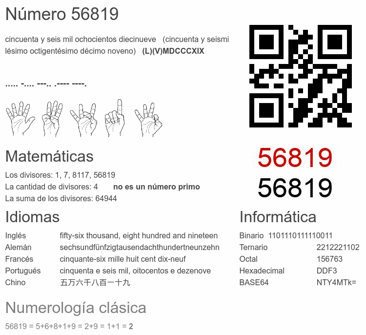 Si conoce algo interesante sobre el número 56819 o cualquier número natural (entero positivo), por favor escríbanos.Número 56 819 en otras unidades