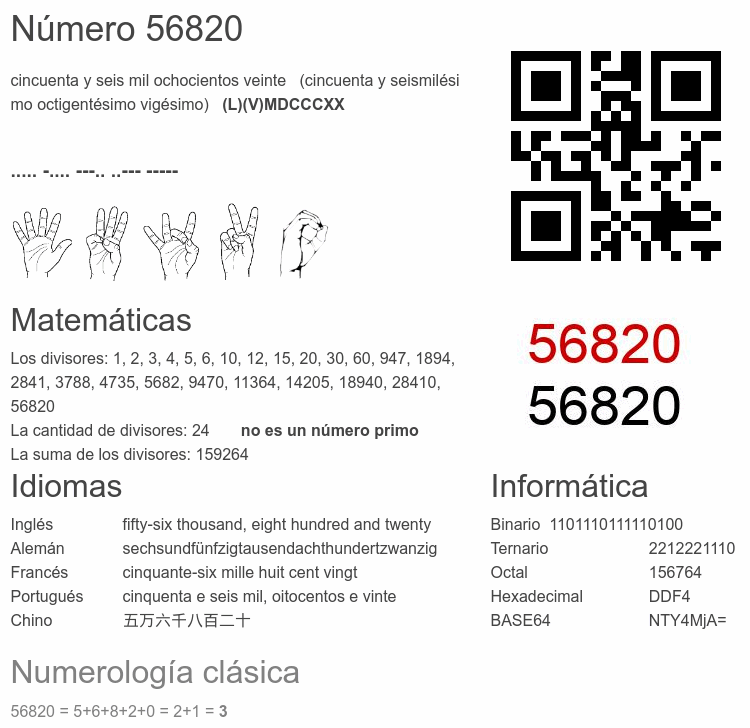 Si conoce algo interesante sobre el número 56820 o cualquier número natural (entero positivo), por favor escríbanos.Número 56 820 en otras unidades