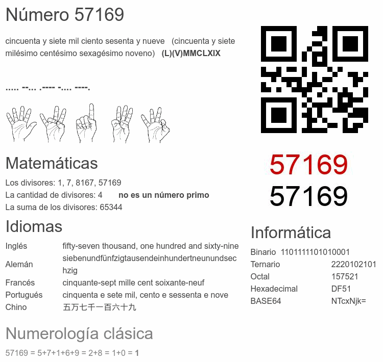 Si conoce algo interesante sobre el número 57169 o cualquier número natural (entero positivo), por favor escríbanos.Número 57 169 en otras unidades