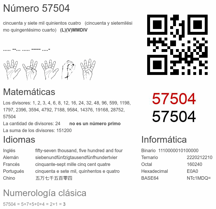 Si conoce algo interesante sobre el número 57504 o cualquier número natural (entero positivo), por favor escríbanos.Número 57 504 en otras unidades