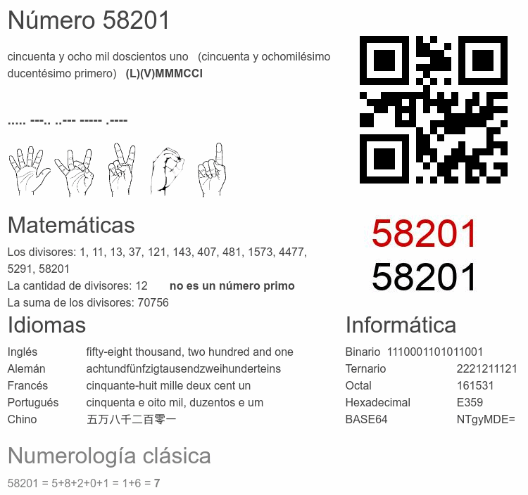 Si conoce algo interesante sobre el número 58201 o cualquier número natural (entero positivo), por favor escríbanos.Número 58 201 en otras unidades