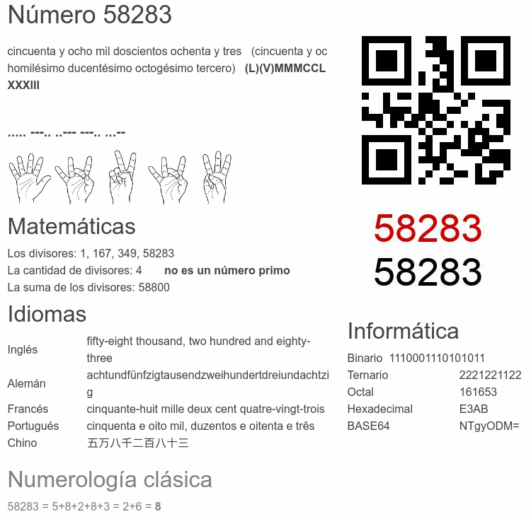 Si conoce algo interesante sobre el número 58283 o cualquier número natural (entero positivo), por favor escríbanos.Número 58 283 en otras unidades