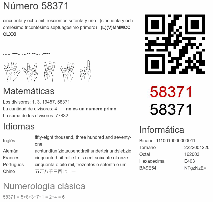 Si conoce algo interesante sobre el número 58371 o cualquier número natural (entero positivo), por favor escríbanos.Número 58 371 en otras unidades