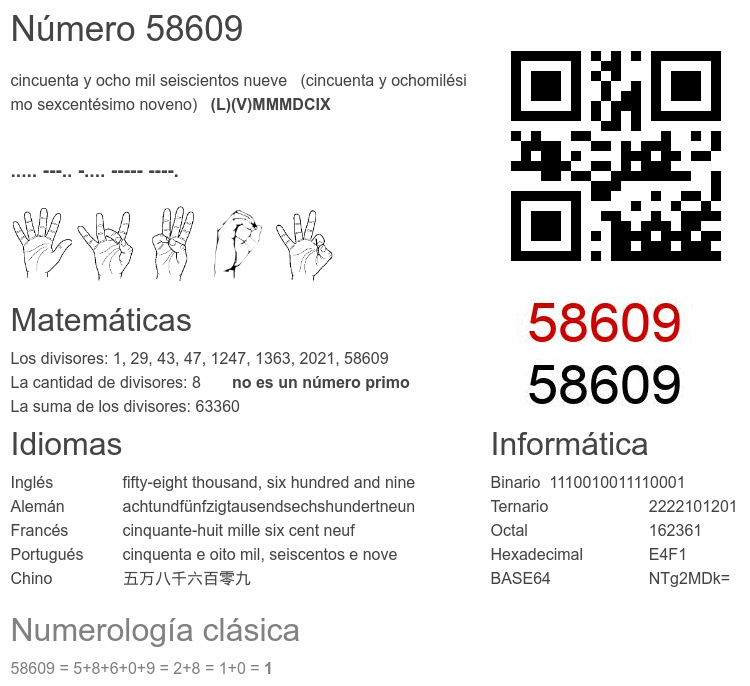 Si conoce algo interesante sobre el número 58609 o cualquier número natural (entero positivo), por favor escríbanos.Número 58 609 en otras unidades