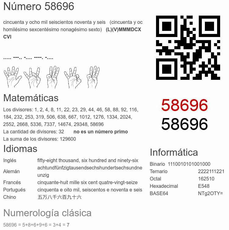 | Japonés: | 🔊 (数 58,696) | 五万八千六百九十六 |