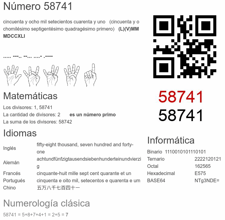 Si conoce algo interesante sobre el número 58741 o cualquier número natural (entero positivo), por favor escríbanos.Número 58 741 en otras unidades