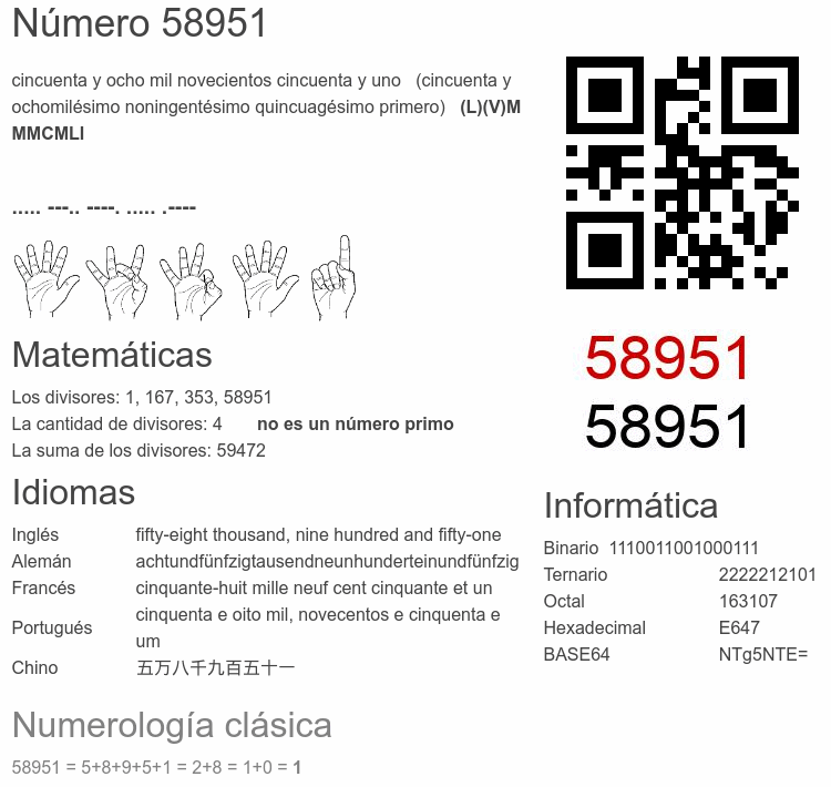Si conoce algo interesante sobre el número 58951 o cualquier número natural (entero positivo), por favor escríbanos.Número 58 951 en otras unidades