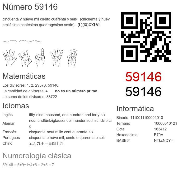 Si conoce algo interesante sobre el número 59146 o cualquier número natural (entero positivo), por favor escríbanos.Número 59 146 en otras unidades