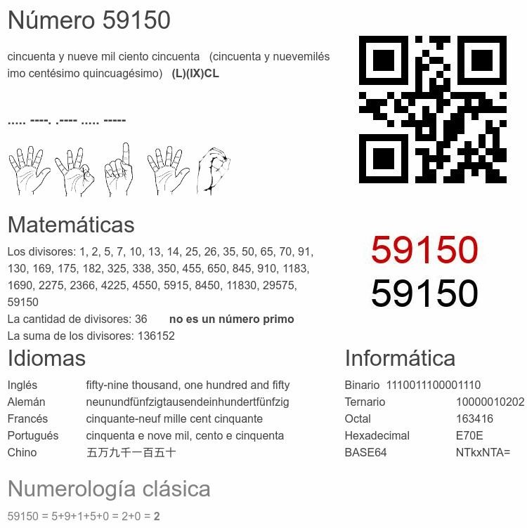 Si conoce algo interesante sobre el número 59150 o cualquier número natural (entero positivo), por favor escríbanos.Número 59 150 en otras unidades