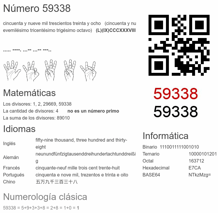 Si conoce algo interesante sobre el número 59338 o cualquier número natural (entero positivo), por favor escríbanos.Número 59 338 en otras unidades