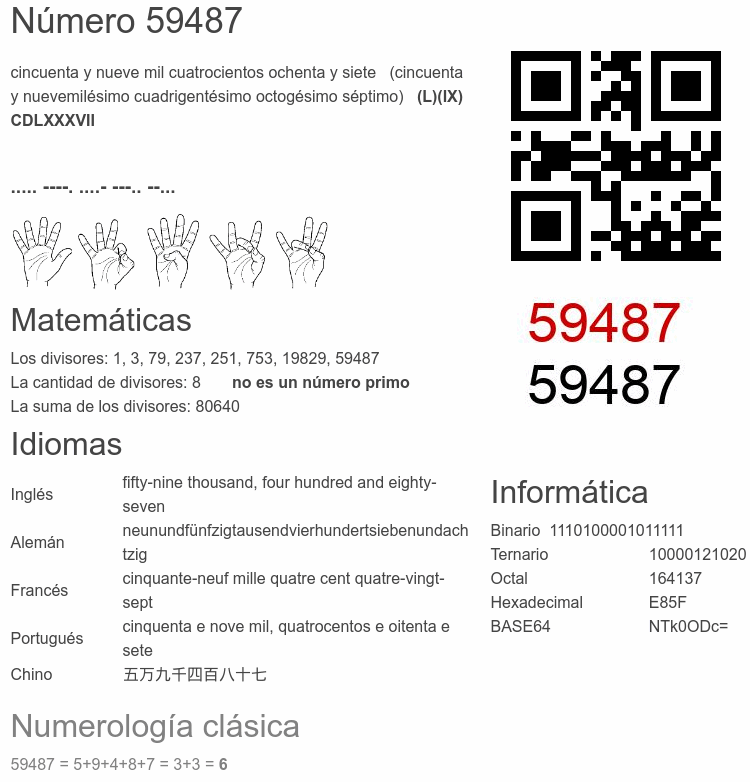 Si conoce algo interesante sobre el número 59487 o cualquier número natural (entero positivo), por favor escríbanos.Número 59 487 en otras unidades