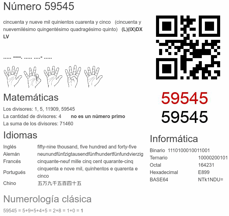Si conoce algo interesante sobre el número 59545 o cualquier número natural (entero positivo), por favor escríbanos.Número 59 545 en otras unidades