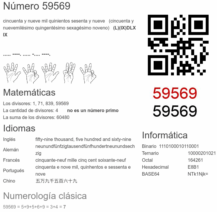 Si conoce algo interesante sobre el número 59569 o cualquier número natural (entero positivo), por favor escríbanos.Número 59 569 en otras unidades