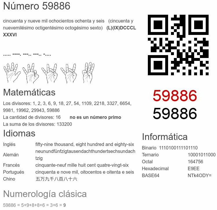 Si conoce algo interesante sobre el número 59886 o cualquier número natural (entero positivo), por favor escríbanos.Número 59 886 en otras unidades