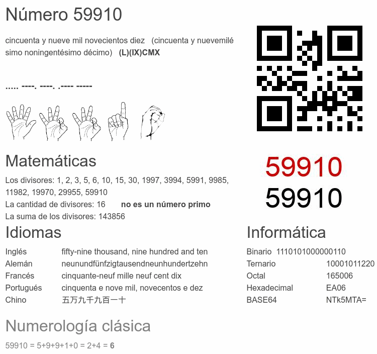 Si conoce algo interesante sobre el número 59910 o cualquier número natural (entero positivo), por favor escríbanos.Número 59 910 en otras unidades