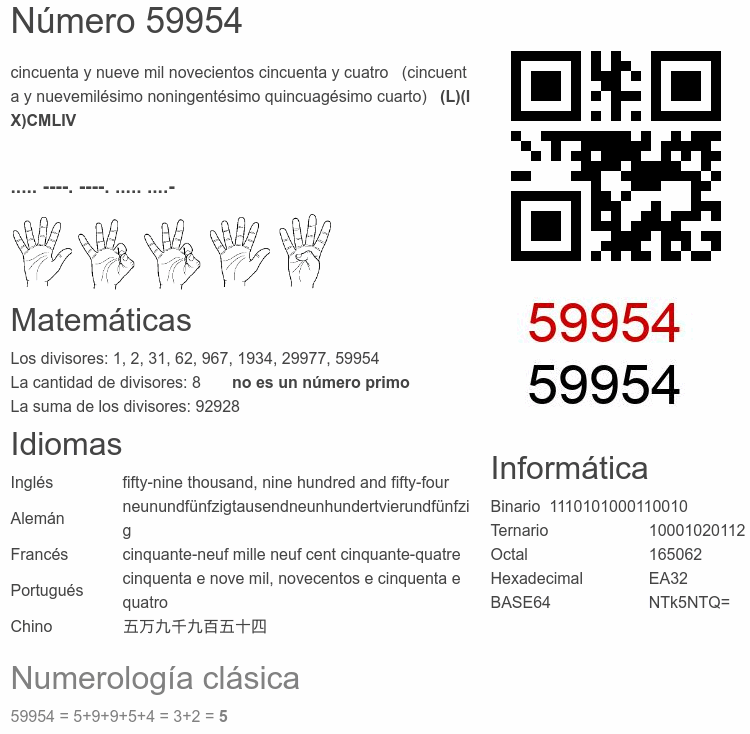 Si conoce algo interesante sobre el número 59954 o cualquier número natural (entero positivo), por favor escríbanos.Número 59 954 en otras unidades