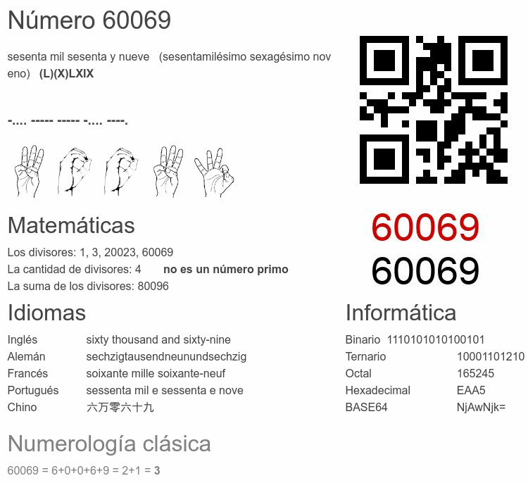 Si conoce algo interesante sobre el número 60069 o cualquier número natural (entero positivo), por favor escríbanos.Número 60 069 en otras unidades