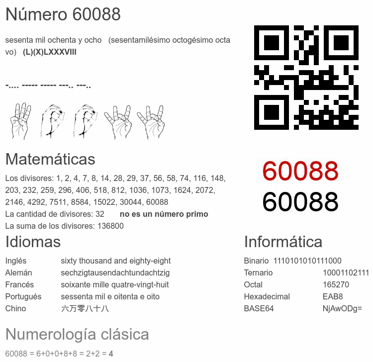 Número 60088 en el código morse: -.... ----- ----- ---.. ---..Lengua de Signos Española 60088: