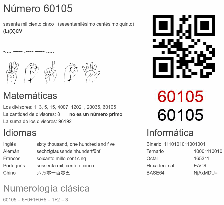 Si conoce algo interesante sobre el número 60105 o cualquier número natural (entero positivo), por favor escríbanos.Número 60 105 en otras unidades