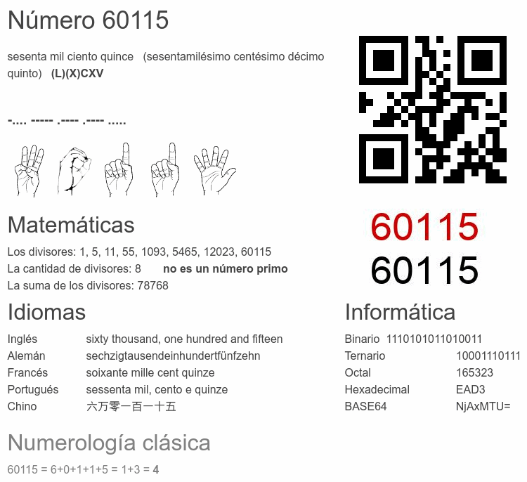 | Francés: | 🔊 (nombre 60 115) | soixante mille cent quinze |