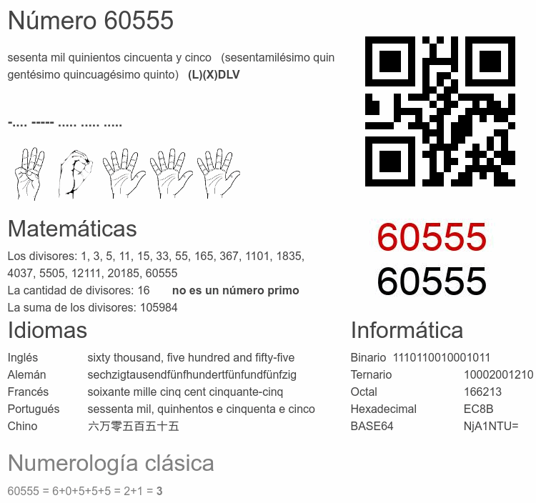 Si conoce algo interesante sobre el número 60555 o cualquier número natural (entero positivo), por favor escríbanos.Número 60 555 en otras unidades