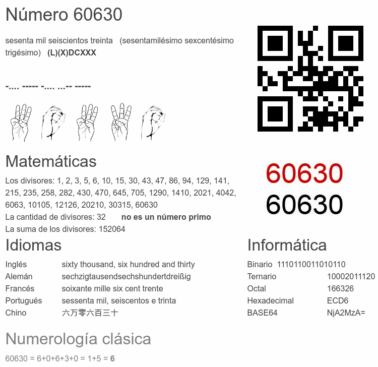 Si conoce algo interesante sobre el número 60630 o cualquier número natural (entero positivo), por favor escríbanos.Número 60 630 en otras unidades