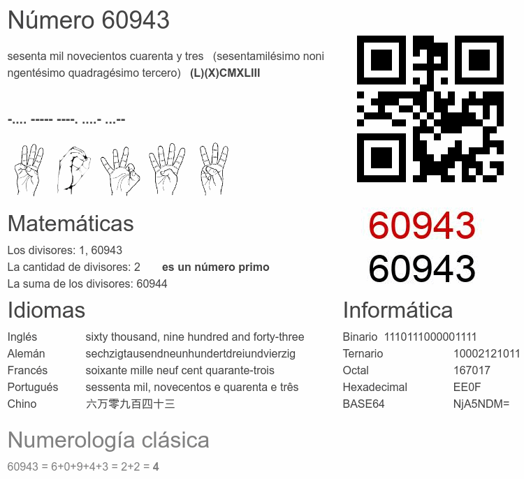 Si conoce algo interesante sobre el número 60943 o cualquier número natural (entero positivo), por favor escríbanos.Número 60 943 en otras unidades