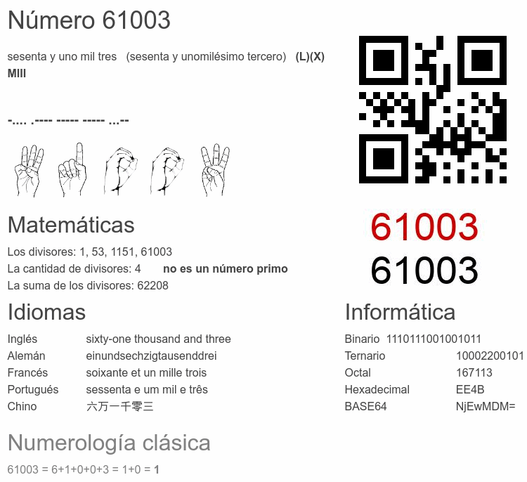 Si conoce algo interesante sobre el número 61003 o cualquier número natural (entero positivo), por favor escríbanos.Número 61 003 en otras unidades