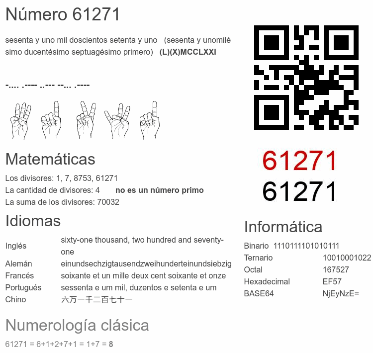 Si conoce algo interesante sobre el número 61271 o cualquier número natural (entero positivo), por favor escríbanos.Número 61 271 en otras unidades