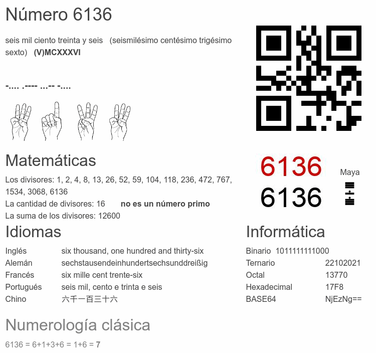 Si conoce algo interesante sobre el número 6136 o cualquier número natural (entero positivo), por favor escríbanos.Número 6 136 en otras unidades
