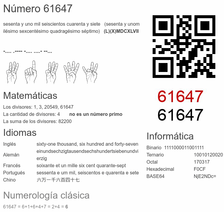 Si conoce algo interesante sobre el número 61647 o cualquier número natural (entero positivo), por favor escríbanos.Número 61 647 en otras unidades