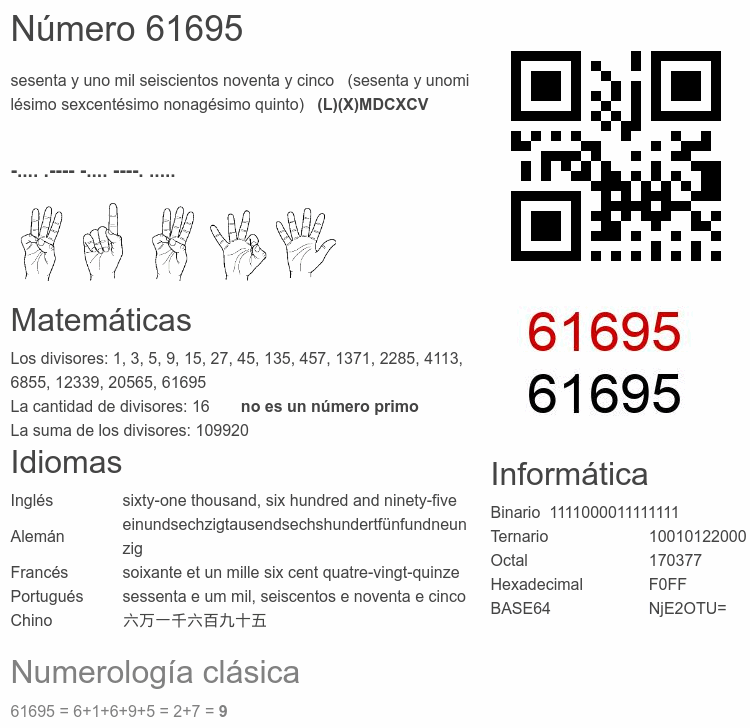 Si conoce algo interesante sobre el número 61695 o cualquier número natural (entero positivo), por favor escríbanos.Número 61 695 en otras unidades