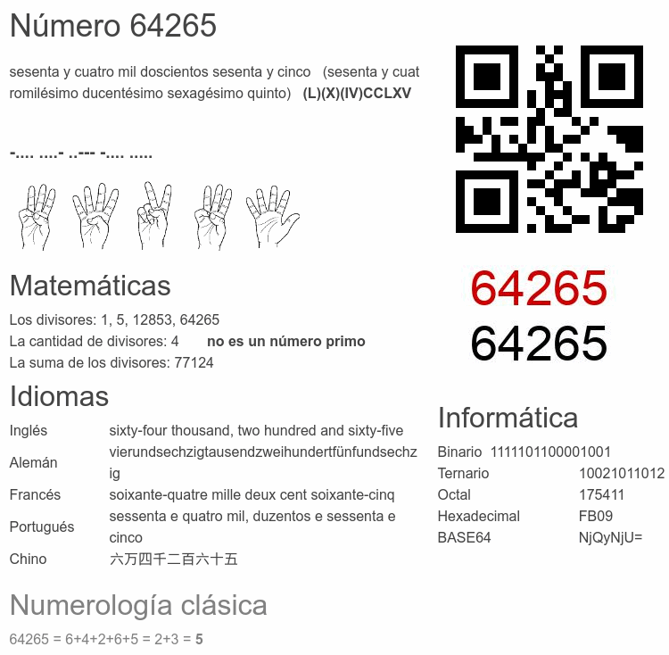 Si conoce algo interesante sobre el número 64265 o cualquier número natural (entero positivo), por favor escríbanos.Número 64 265 en otras unidades