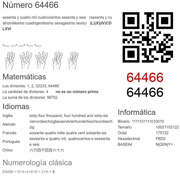 Si conoce algo interesante sobre el número 64466 o cualquier número natural (entero positivo), por favor escríbanos.Número 64 466 en otras unidades