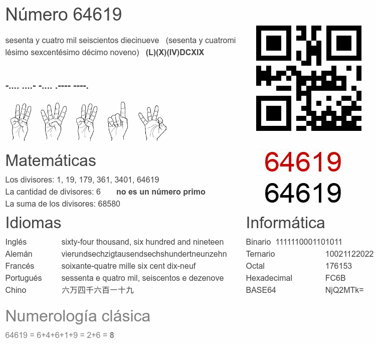 Si conoce algo interesante sobre el número 64619 o cualquier número natural (entero positivo), por favor escríbanos.Número 64 619 en otras unidades