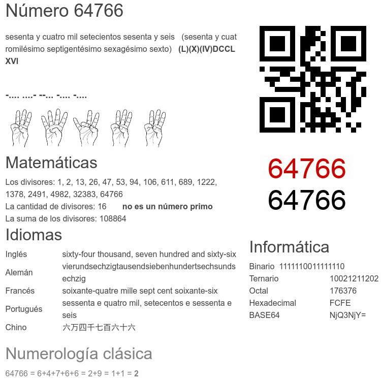 Si conoce algo interesante sobre el número 64766 o cualquier número natural (entero positivo), por favor escríbanos.Número 64 766 en otras unidades