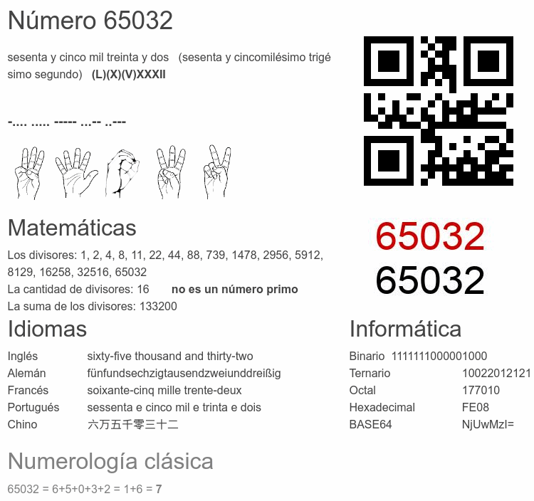 Si conoce algo interesante sobre el número 65032 o cualquier número natural (entero positivo), por favor escríbanos.Número 65 032 en otras unidades