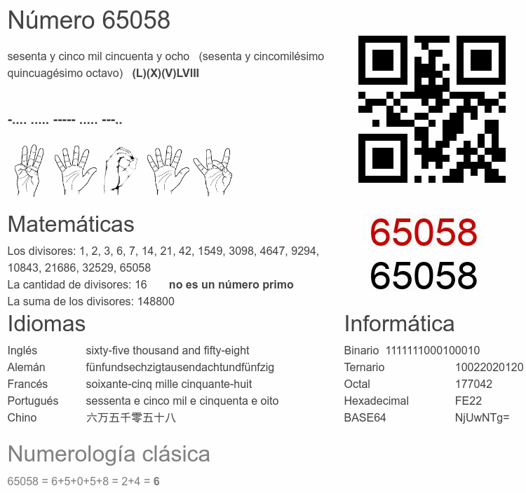 Si conoce algo interesante sobre el número 65058 o cualquier número natural (entero positivo), por favor escríbanos.Número 65 058 en otras unidades
