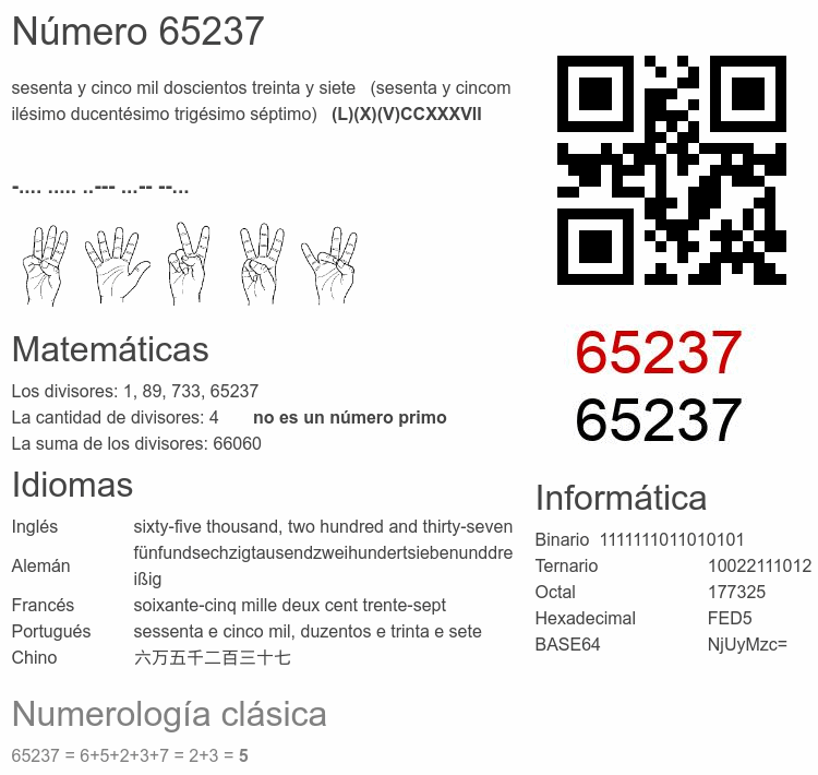 Curiosidades del número 65237