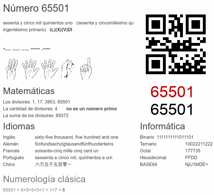 Si conoce algo interesante sobre el número 65501 o cualquier número natural (entero positivo), por favor escríbanos.Número 65 501 en otras unidades